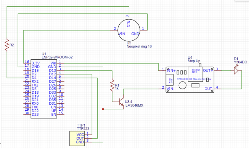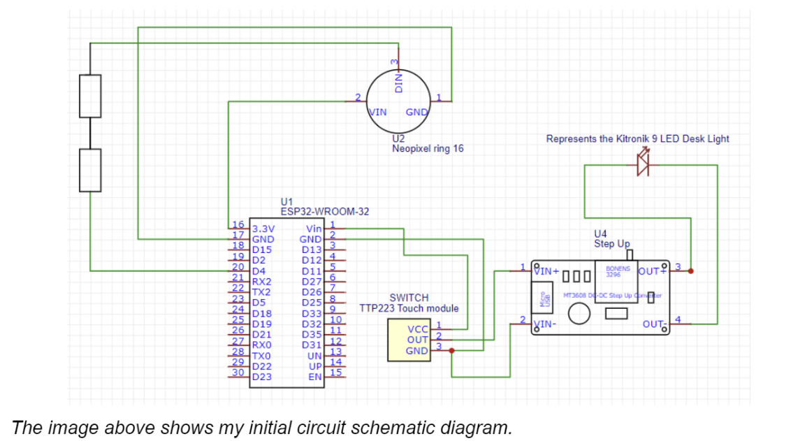 My initial circuit diagram (with only the manual switch having control of the main desk light) features a connection to a DC to DC step up voltage converter. This is in place as the output voltage of the switch is only 3.3V whilst the Kitronik Desk light requires 5V. Thus, to ensure that the light glows to its potential, I have increased the voltage between the switch and the main light.