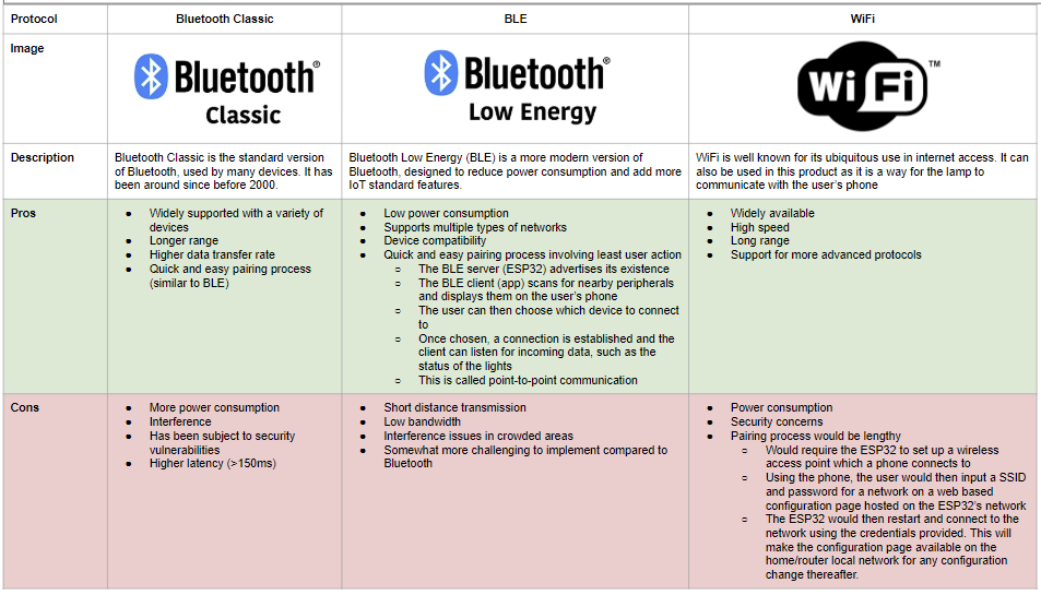 Given the advantages and disadvantages of these wireless communication protocols, I decided to use Bluetooth Low Energy (BLE) since it meets the energy efficiency requirements as it has low power consumption. In addition, it is low cost and is efficient for sending small packets of data, making it ideal for this purpose. Although BLE tends to have a short range, this is unlikely to hinder the end product as the lamp is designed to be used across the room/short distances.