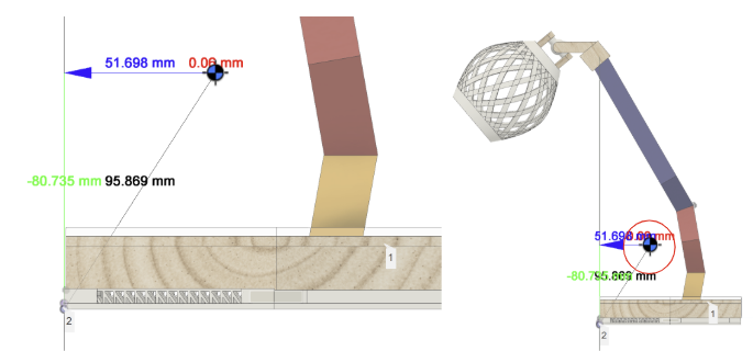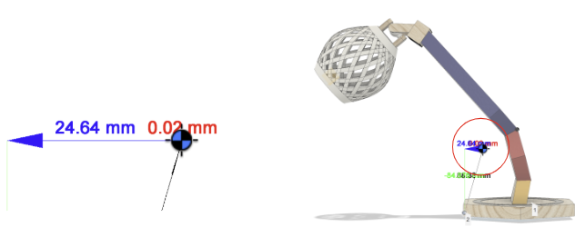 As the main frame of the lamp was angled forwards, I used Fusion 360’s centre of mass feature to find whether the point fell near the centre of the base of the object.