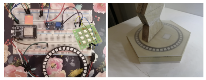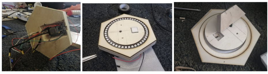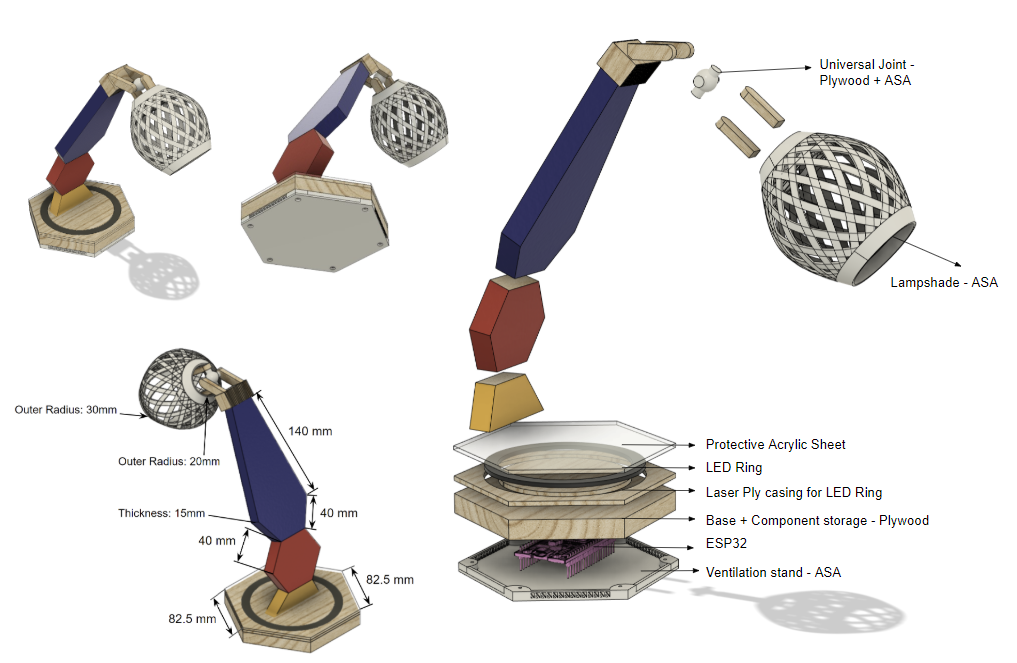 The base of the lamp houses the LED ring light that will be controlled through the mobile app and the ESP32 that is going to be placed within the base hexagon.