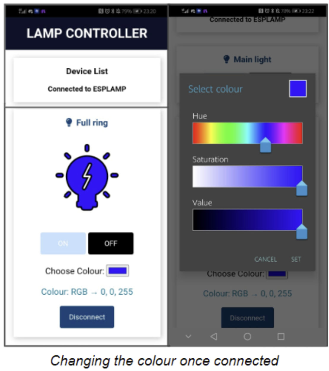 Once connected, I have developed an interface in the app that allows the user to switch the light on/off and change the colour using a colour picker.