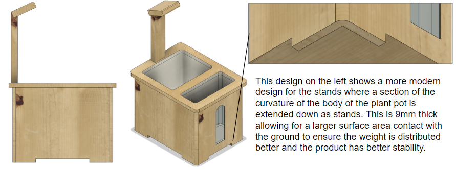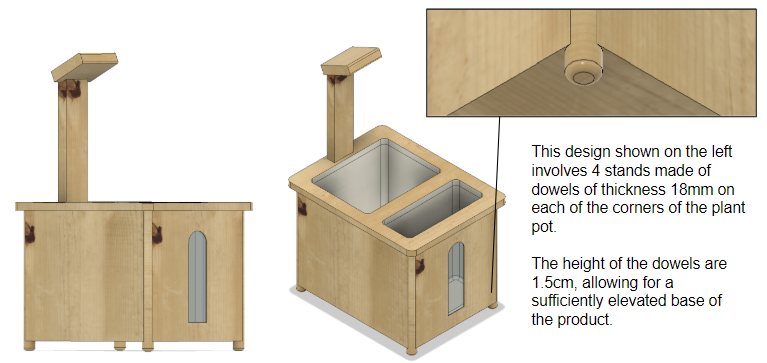 I realised that placing all the weight on four 18 mm dowels wasn’t ideal. From a manufacturing perspective, attaching four dowels to the corners could introduce structural weakness, since each dowel would rely solely on its bond to the base of the plant pot. Thus, I redesigned the stand to have a larger surface area and greater structural strength. Instead of being glued onto the bottom, the stand is now integrated into the wooden frame that forms the main structure of the plant pot.