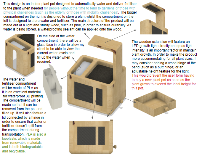 The final design showcases the growth light within a PLA encasing (which also houses the LDR and the temperature sensor) attached to the main body through a hinge joint. I also included the soil moisture sensor within its own encasing as well connected to the main pot with yellow wiring. On the side, I have included a water level viewing window, with RGB lights to show when the water pump is activated. Below these lights, I've placed a hexagonal press button which turns the whole system on. The water compartment also includes a water pump holder.