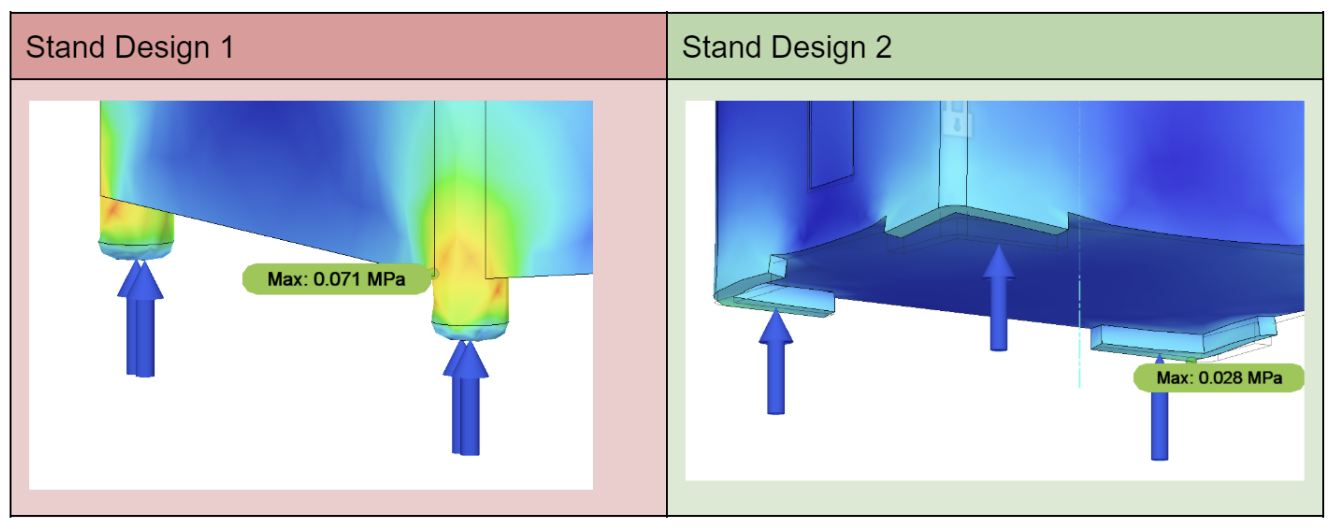 To verify the structural strength of the stands, I used Fusion 360’s simulation environment to perform a stress test on the stands by approximating the weight of the plant pot and applying this on the base of the plant pot. I found that the internal pressure with the second design was 2.5 times lower than the pressure with the previous stand design: