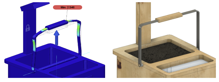 To evaluate the suitability of the handle material, I calculated the safety factor of the design. When tested using mild steel, the minimum safety factor was 2.546 and hence, the design would be able to comfortably withstand the load.