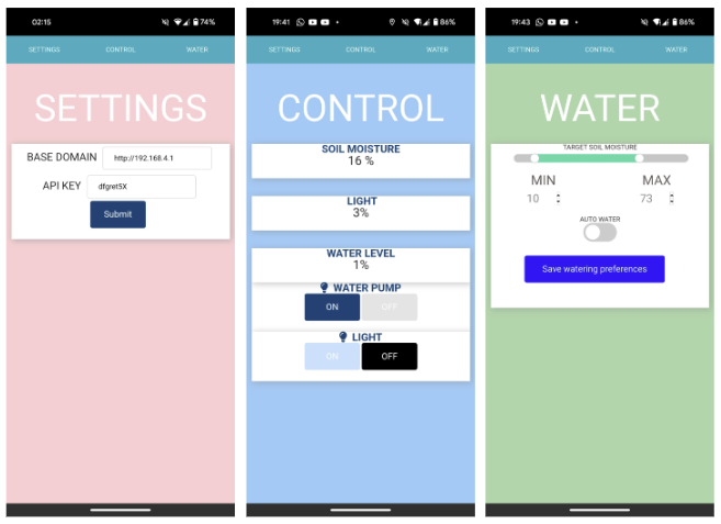 - Settings (pink screen): This view allows the user to input a base domain to which the ESP32 must send the requests and receive the data. This will be the domain the ESP32 is connected to on that specific network. The user must also send an API key. This API key will be checked against the API key stored in the ESP32. This ensures that only the owner of the plant pot can control the pot wirelessly, ensuring that the plant pot is secure.