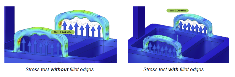 I once again performed a stress test to find the weak points of the handle. I placed a force on the underside of both handles to simulate the load of someone carrying the product. There was more stress on the corners of the handle and so I added extra fillet edges on the corner (shown in the picture on the right).