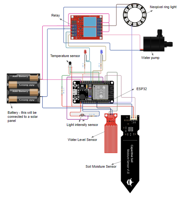 - This houses the ESP32 and the connections with the sensors as well. This is placed underneath the soil compartment and also allows access to replace batteries at the bottom.