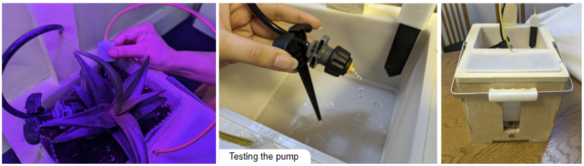 - This is located next to the soil compartment for easy access. It has a lid on top which can be removed for refilling and a submersible pump is placed inside which delivers water to the dripper when activated