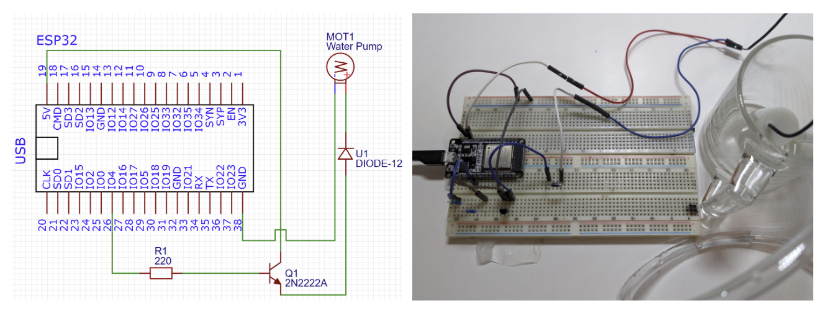 I decided to buy and test a vertical submersible water pump. I connected it to an ESP32 microcontroller. To be able to control the pump, I used a transistor as a switch and connected the base to a GPIO pin. I also included a diode in the circuit to prevent back electromotive force from the pump. However, this setup resulted in low water pressure which was not enough to push the water up from the water compartment. When I directly connected the battery to the pump, it resulted in a much higher flow rate, indicating that the transistor setup perhaps limited that current to the motor.
