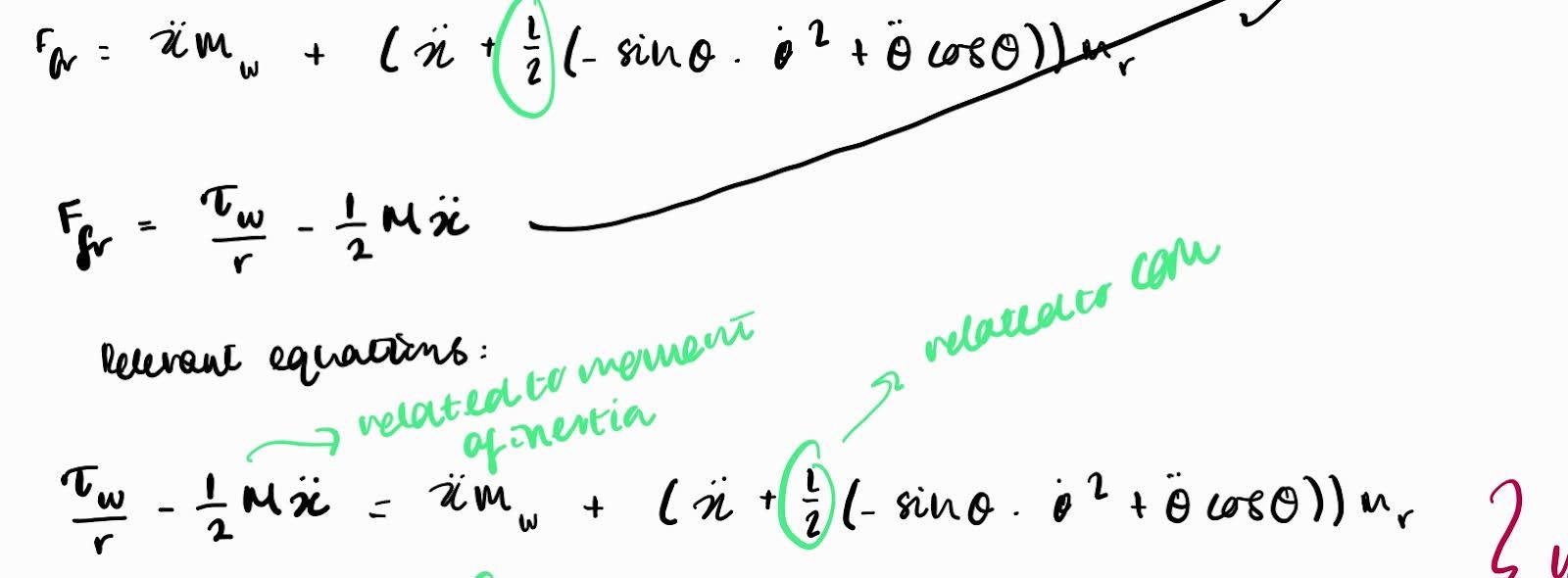 Now that we have our two equations, we rearrange the simultaneous equations to get equations with theta double dot and x double dot as the subject. Rearranging these equations is rather arduous manually, so we’ll use np.linalg to do this: