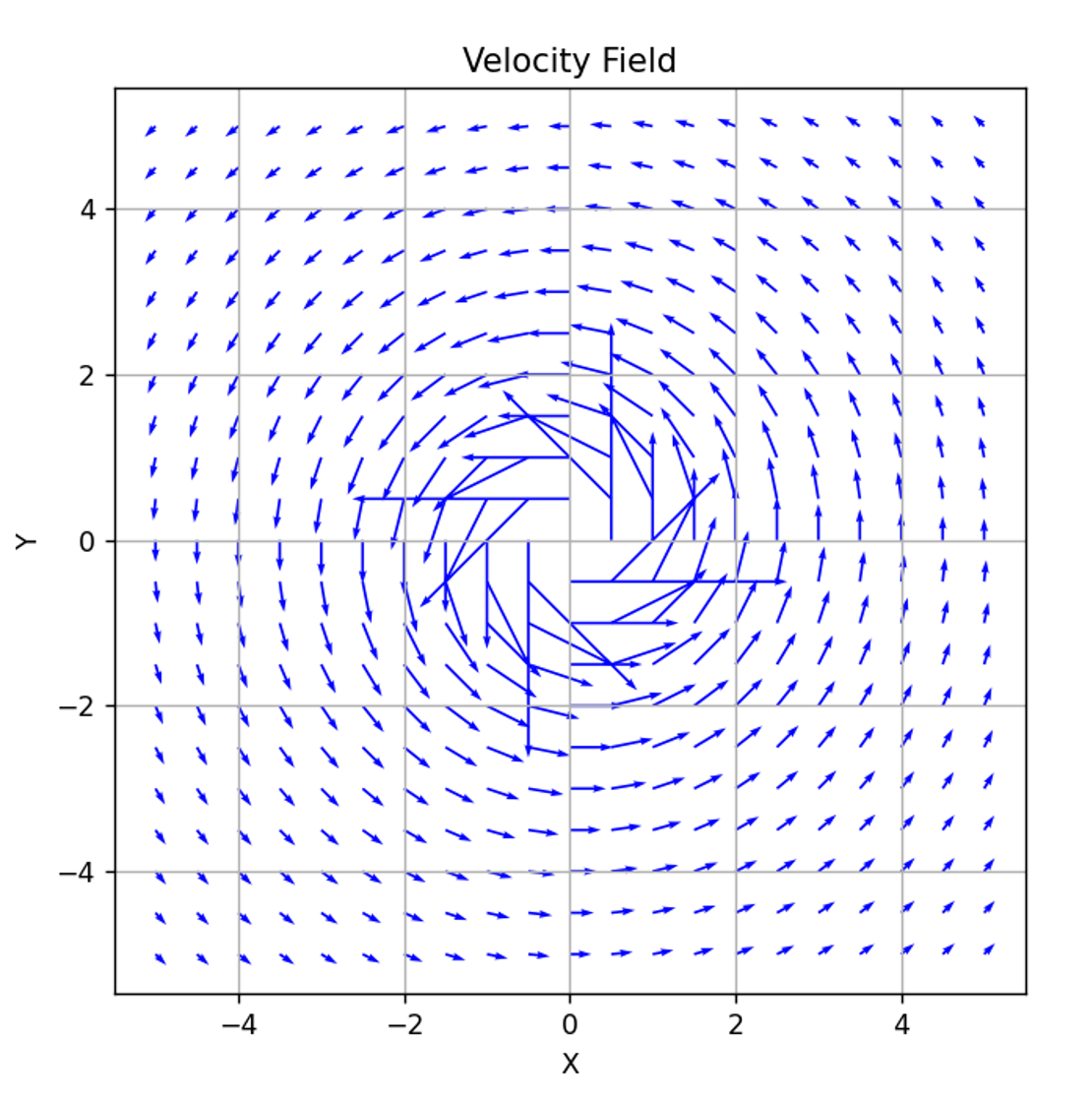 In code, to plot the velocity at each point in the grid, this becomes: