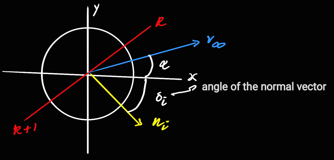 As shown in the drawing above, we can make some relations between the angles involved in each panel. Given the angle of attack is at $\alpha$ radians and the normal vector $\n_i$ is at $\sigma_i$ radians measured from the positive x-axis, we can write the angle from the freestream velocity to the normal vector as $\sigma_i - \alpha$. We’ll call this angle $\beta_i$ for panel i.